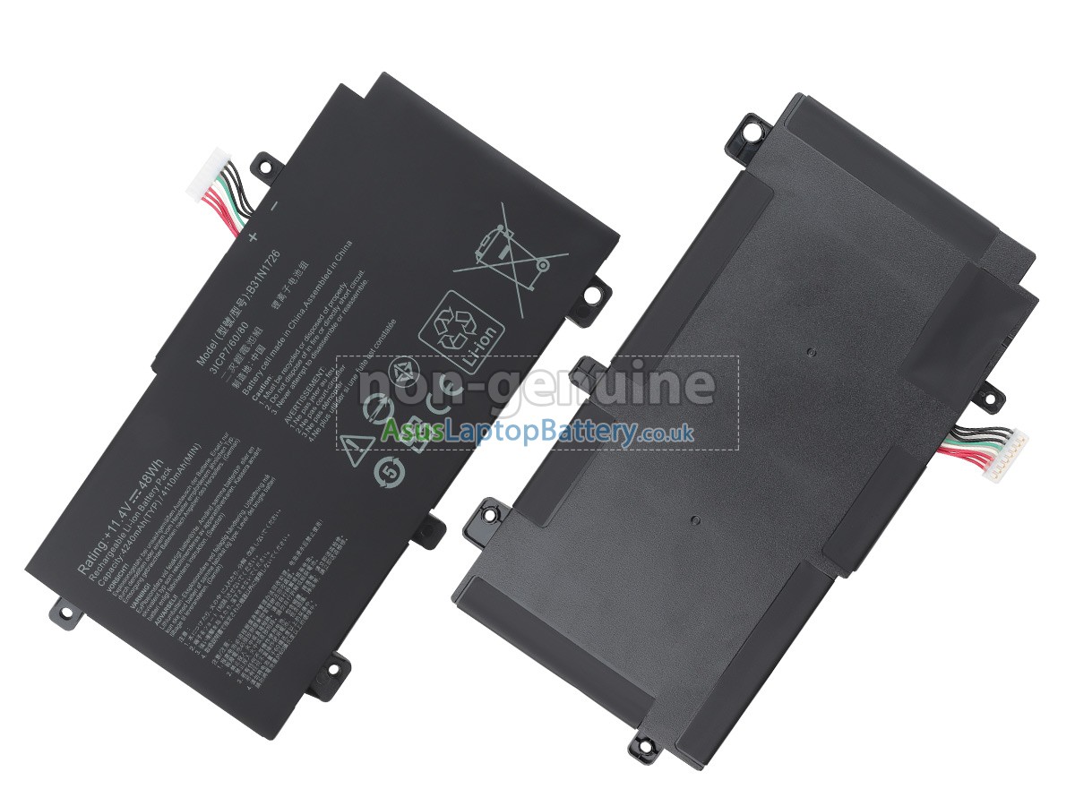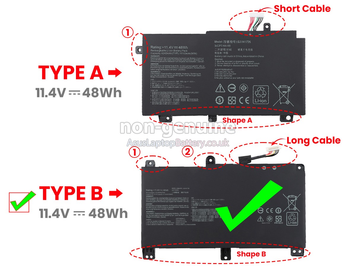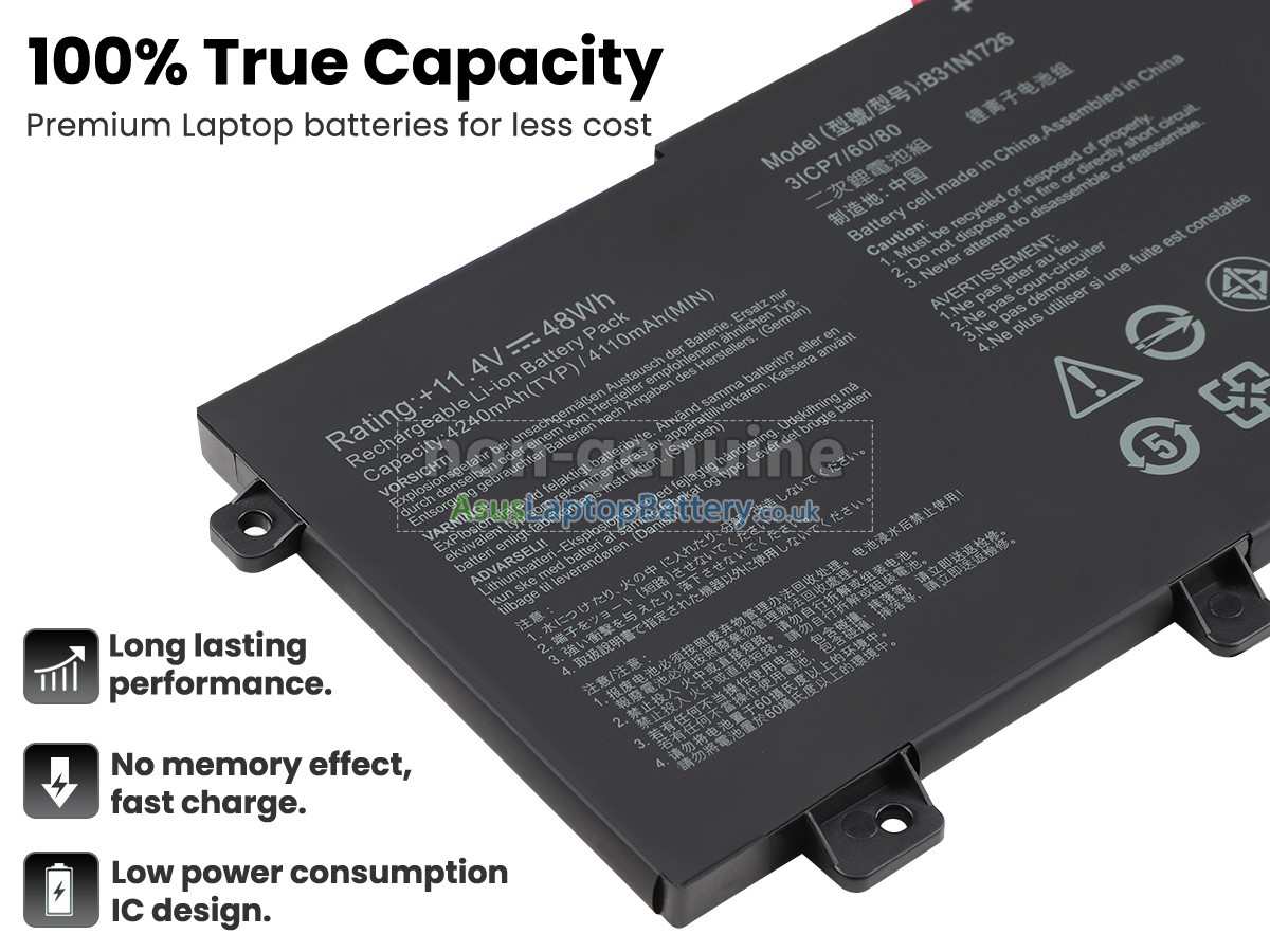 Thank you for purchasing this high-quality replacement Asus B31N1726 notebook battery from Asuslaptopbattery.co.uk. We have a rigorous testing process to ensure that the products you ordered (like this battery for Asus B31N1726 laptop) function correctly before they are packaged and shipped to you. Before placing your order, please make sure that your old original battery's part number is listed below and that it is the same shape as our battery image (please see the larger image for details).