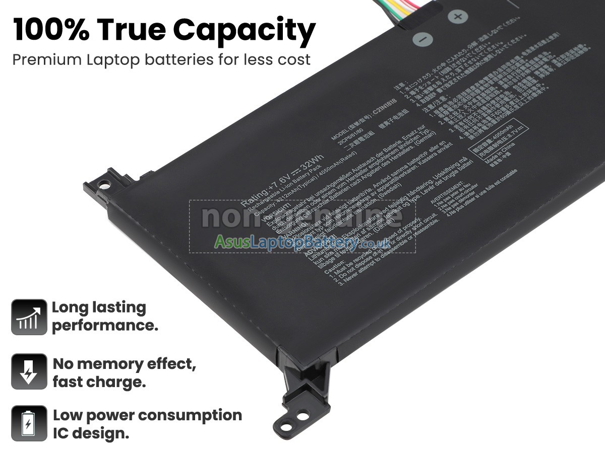 Thank you for purchasing this high-quality replacement Asus C21N1818-2 notebook battery from Asuslaptopbattery.co.uk. We have a rigorous testing process to ensure that the products you ordered (like this battery for Asus C21N1818-2 laptop) function correctly before they are packaged and shipped to you. Before placing your order, please make sure that your old original battery's part number is listed below and that it is the same shape as our battery image (please see the larger image for details).