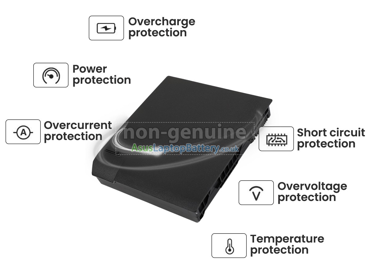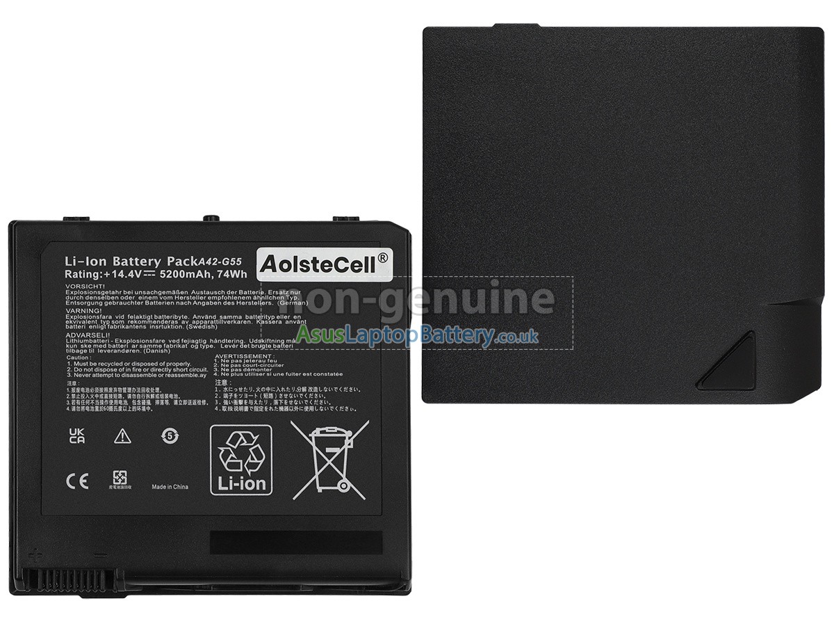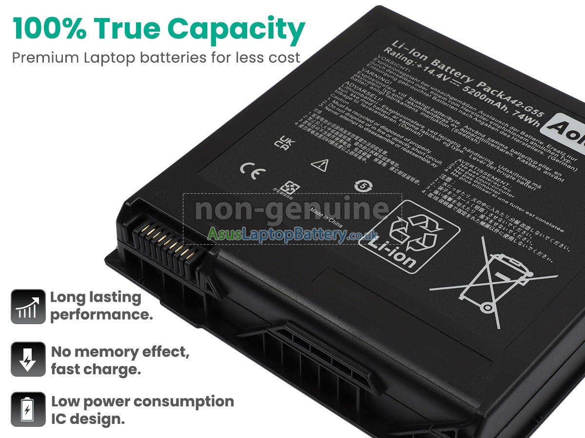 This brand-new replacement battery for Asus G55VM laptop is made from premium Li-ion batteries from Samsung, LG, and Panasonic to ensure optimal performance. This replacement Asus G55VM battery pack has been specially designed with multiple protection circuits to ensure maximum safety. The battery pack's casing is made of non-flammable and highly durable plastic that is flame retardant to prevent damage when dropped from a low height.