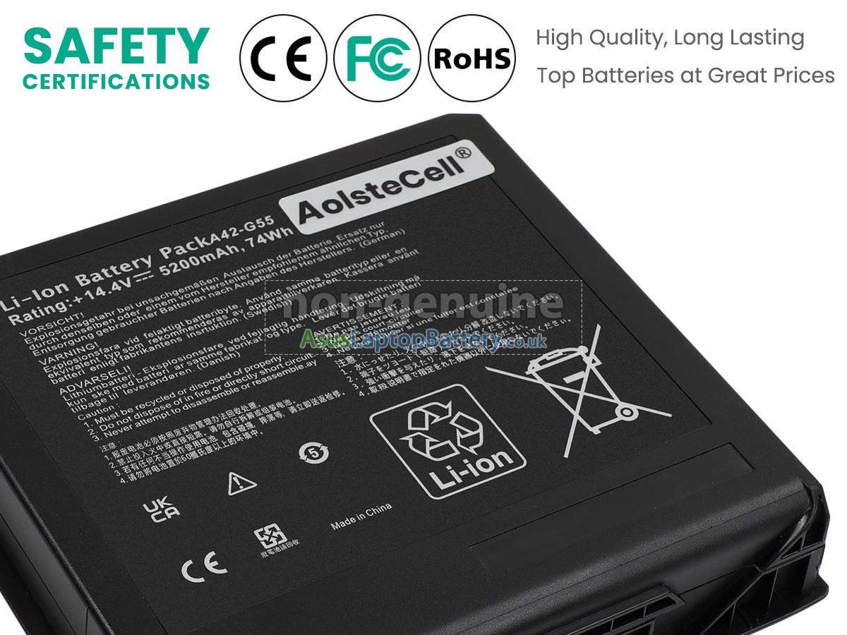 100% OEM compatible, guaranteed to meet the specifications of your original battery (ensuring the same size and high quality). All of our replacement Asus G55VM batteries are internationally certified (CE, UL, ROHS, ISO9001/9002).