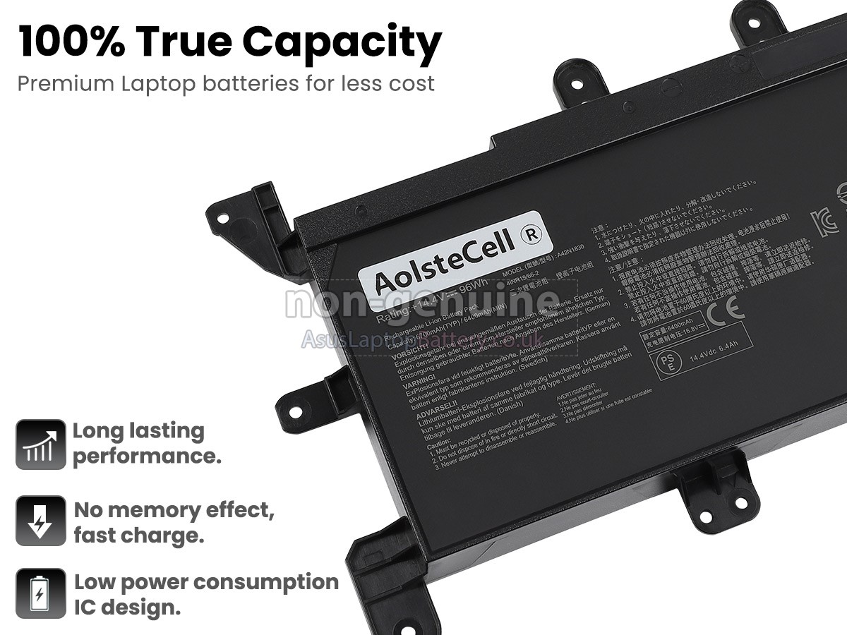 This brand-new replacement battery for Asus Rog GRIFFIN GZ755GXR laptop is made from premium Li-Polymer batteries from Samsung, LG, and Panasonic to ensure optimal performance. This replacement Asus Rog GRIFFIN GZ755GXR battery pack has been specially designed with multiple protection circuits to ensure maximum safety. The battery pack's casing is made of non-flammable and highly durable plastic that is flame retardant to prevent damage when dropped from a low height.
