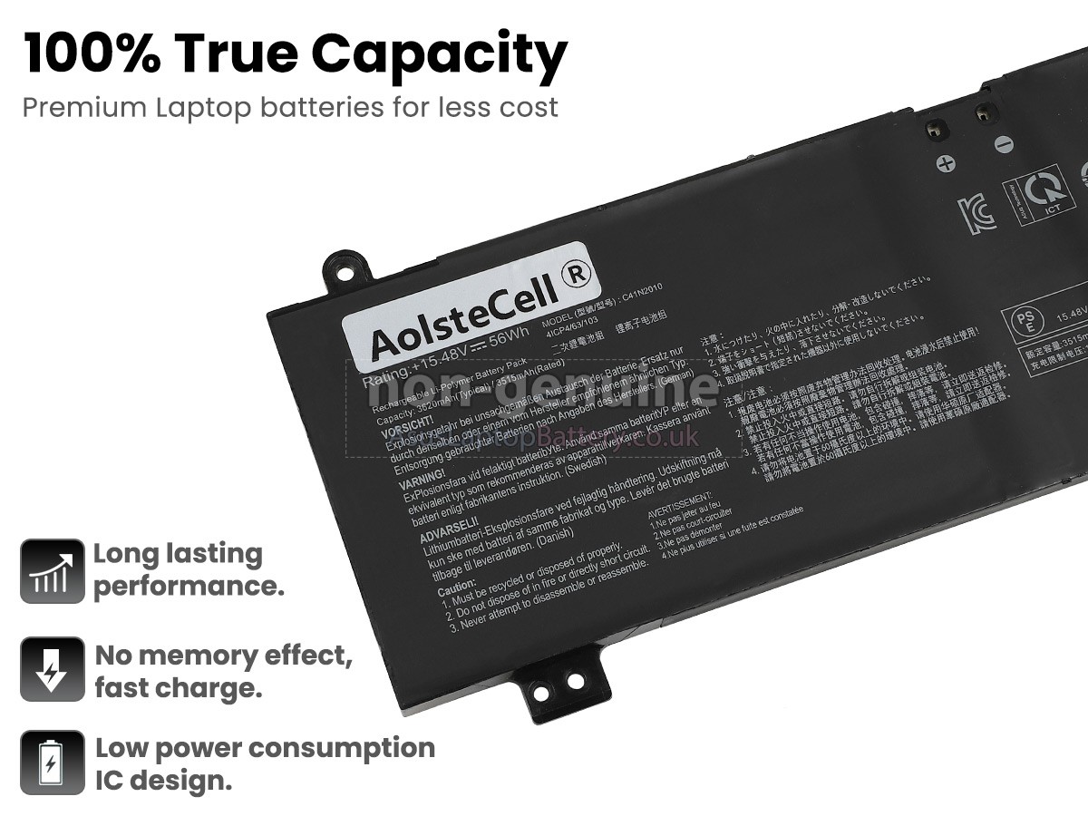 This brand-new replacement battery for Asus Rog STRIX G15 G513RS laptop is made from premium Li-Polymer batteries from Samsung, LG, and Panasonic to ensure optimal performance. This replacement Asus Rog STRIX G15 G513RS battery pack has been specially designed with multiple protection circuits to ensure maximum safety. The battery pack's casing is made of non-flammable and highly durable plastic that is flame retardant to prevent damage when dropped from a low height.