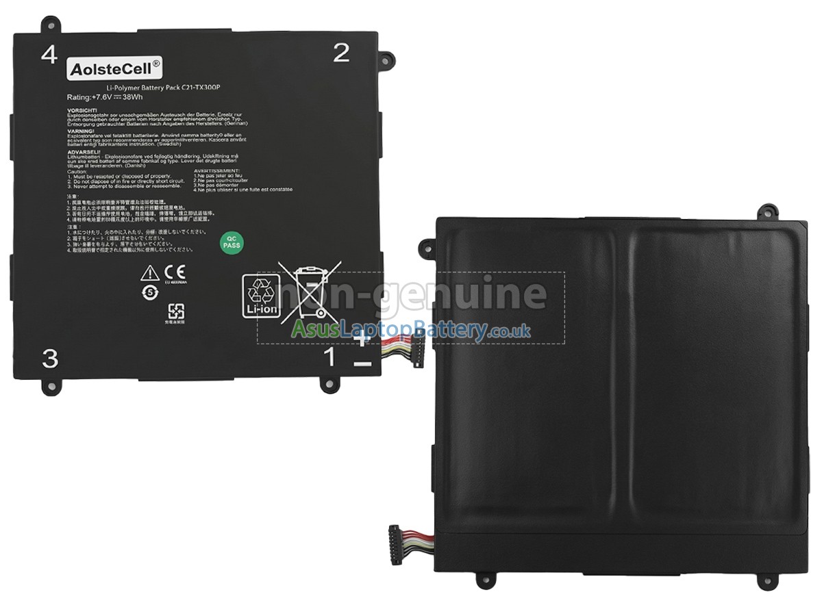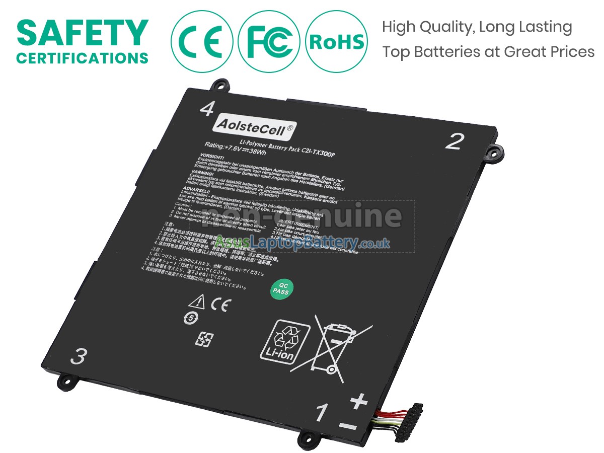 Thank you for purchasing this high-quality replacement Asus Transformer Book TX300D notebook battery from Asuslaptopbattery.co.uk. We have a rigorous testing process to ensure that the products you ordered (like this battery for Asus Transformer Book TX300D laptop) function correctly before they are packaged and shipped to you. Before placing your order, please make sure that your old original battery's part number is listed below and that it is the same shape as our battery image (please see the larger image for details).