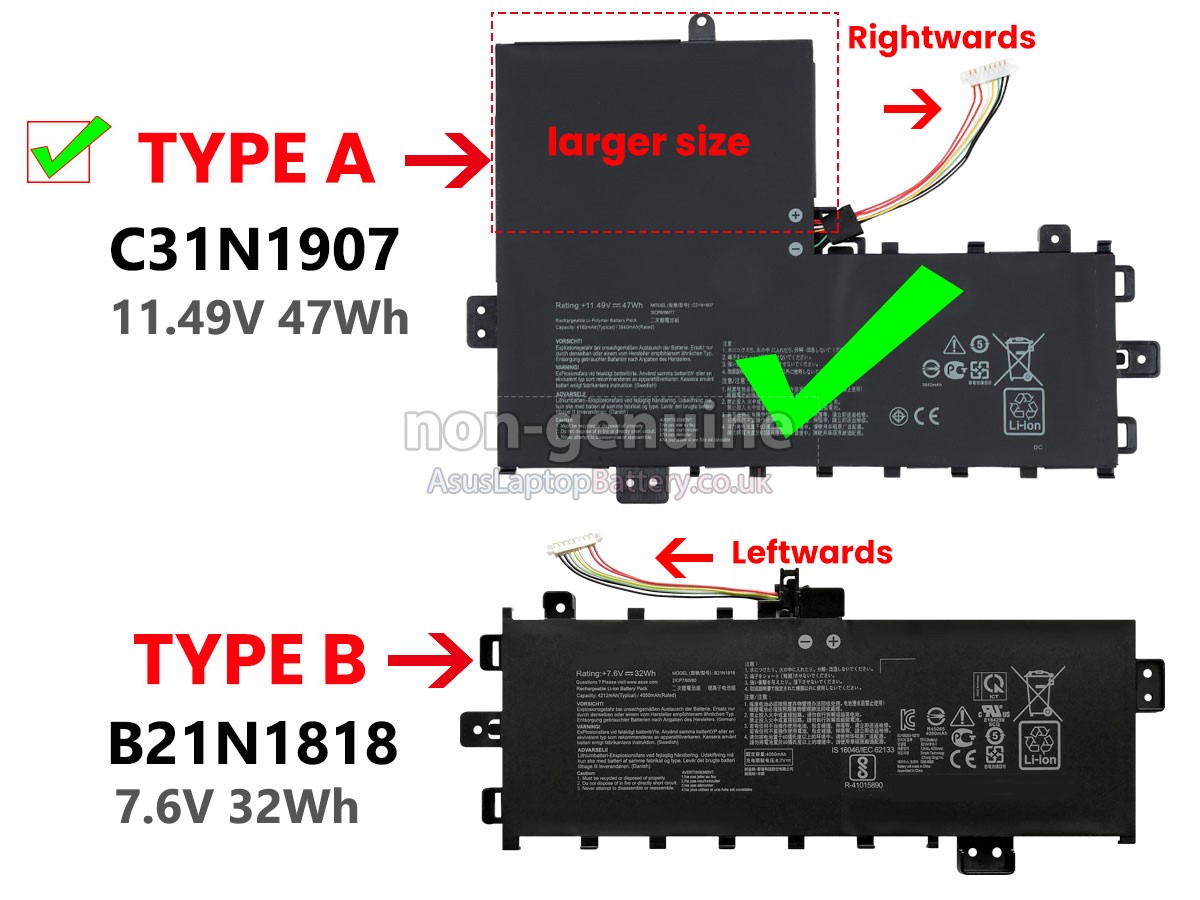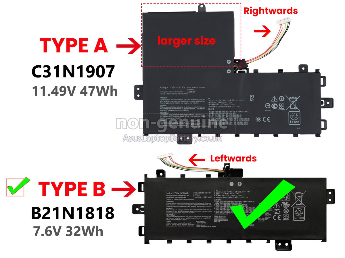 Thank you for purchasing this high-quality replacement Asus VivoBook 17 S712DA-BX330 notebook battery from Asuslaptopbattery.co.uk. We have a rigorous testing process to ensure that the products you ordered (like this battery for Asus VivoBook 17 S712DA-BX330 laptop) function correctly before they are packaged and shipped to you. Before placing your order, please make sure that your old original battery's part number is listed below and that it is the same shape as our battery image (please see the larger image for details).