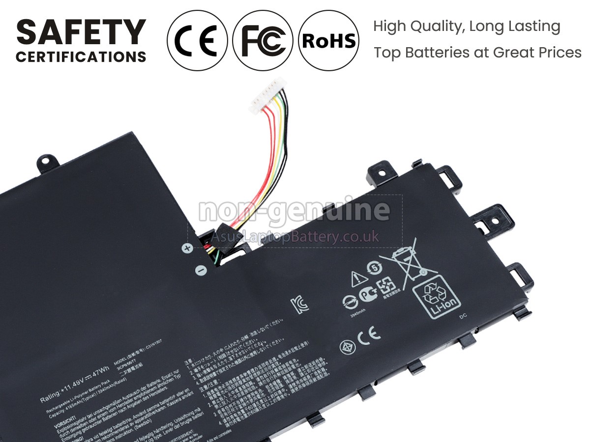 All of our high-quality replacement batteries for Asus VivoBook 17 S712DA-BX330 notebook are tested and proven to match and/or exceed the performance of the original battery and are 100% compatible with the original manufacturer's specifications. Each of our replacement batteries is systematically tested and verified to ensure the safety of your laptop. This battery for Asus VivoBook 17 S712DA-BX330 is backed by a 1-year limited warranty.