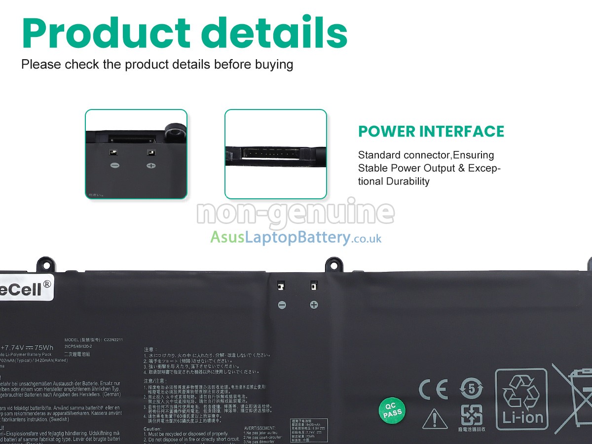 100% OEM compatible, guaranteed to meet the specifications of your original battery (ensuring the same size and high quality). All of our replacement Asus ZenBook 14 OLED UX3405MA-TU7161W batteries are internationally certified (CE, UL, ROHS, ISO9001/9002).