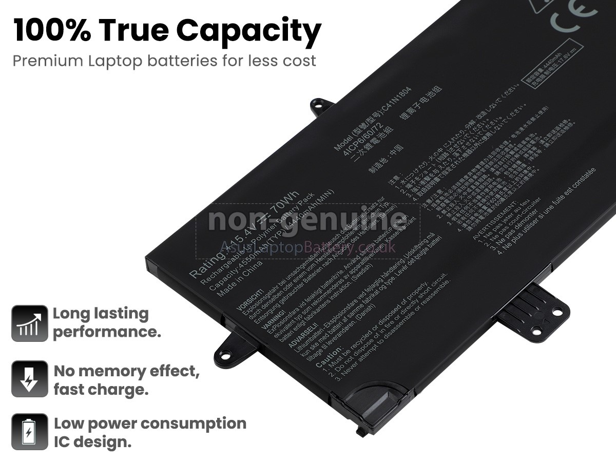 This brand-new replacement battery for Asus ZenBook Pro UX480FD-BE023T laptop is made from premium Li-Polymer batteries from Samsung, LG, and Panasonic to ensure optimal performance. This replacement Asus ZenBook Pro UX480FD-BE023T battery pack has been specially designed with multiple protection circuits to ensure maximum safety. The battery pack's casing is made of non-flammable and highly durable plastic that is flame retardant to prevent damage when dropped from a low height.