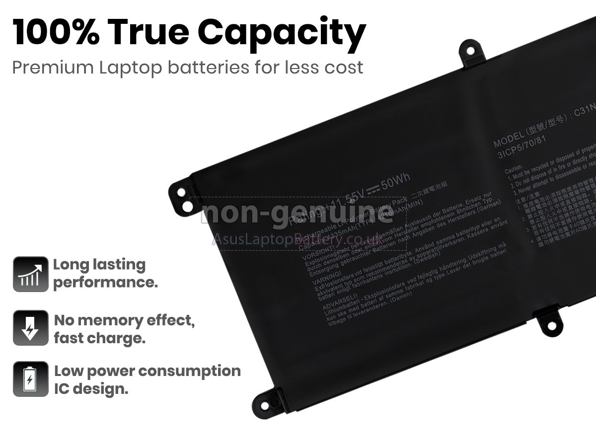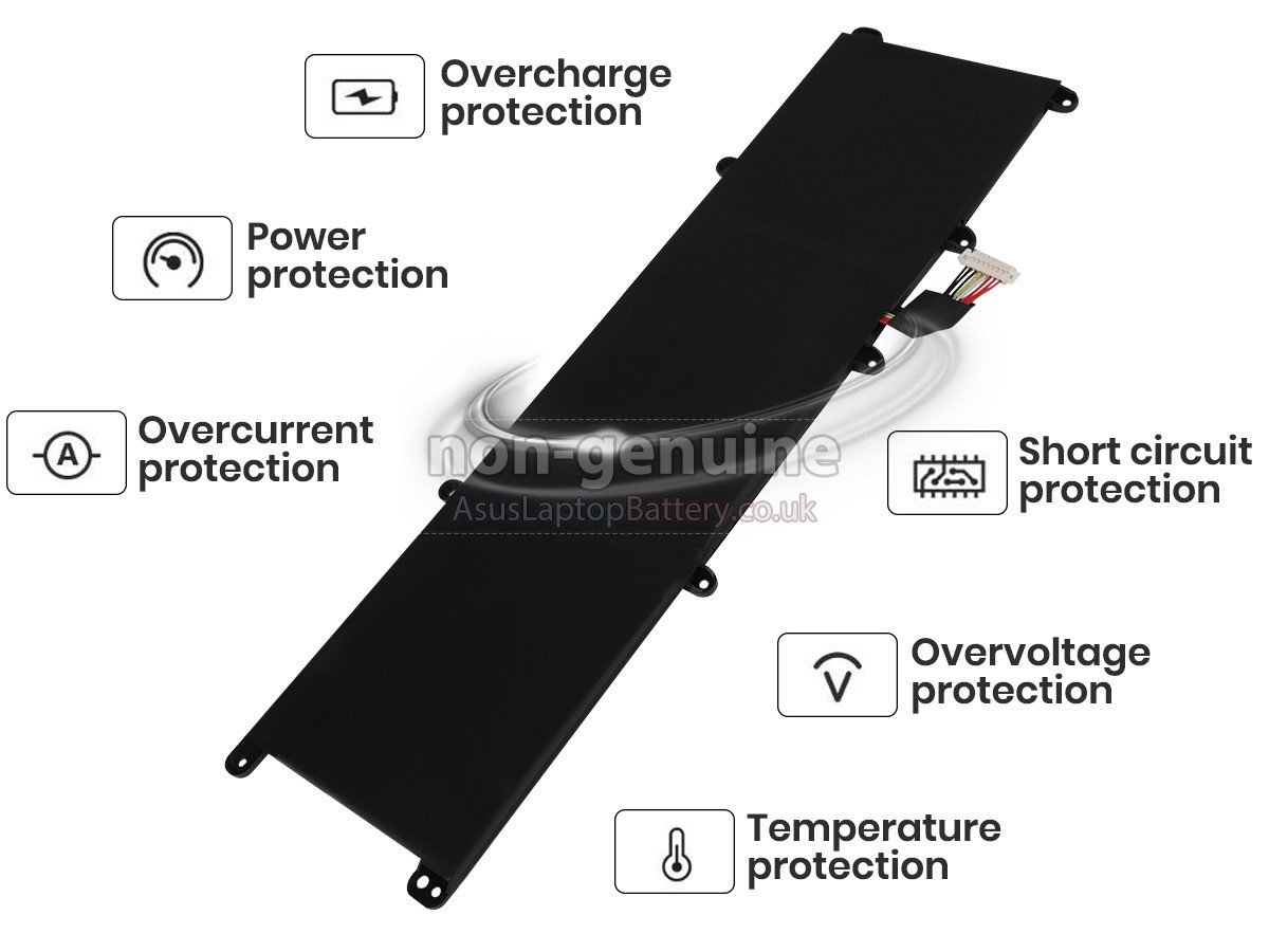 This brand-new replacement battery for Asus ZenBook UX530UX-FY040T laptop is made from premium Li-Polymer batteries from Samsung, LG, and Panasonic to ensure optimal performance. This replacement Asus ZenBook UX530UX-FY040T battery pack has been specially designed with multiple protection circuits to ensure maximum safety. The battery pack's casing is made of non-flammable and highly durable plastic that is flame retardant to prevent damage when dropped from a low height.