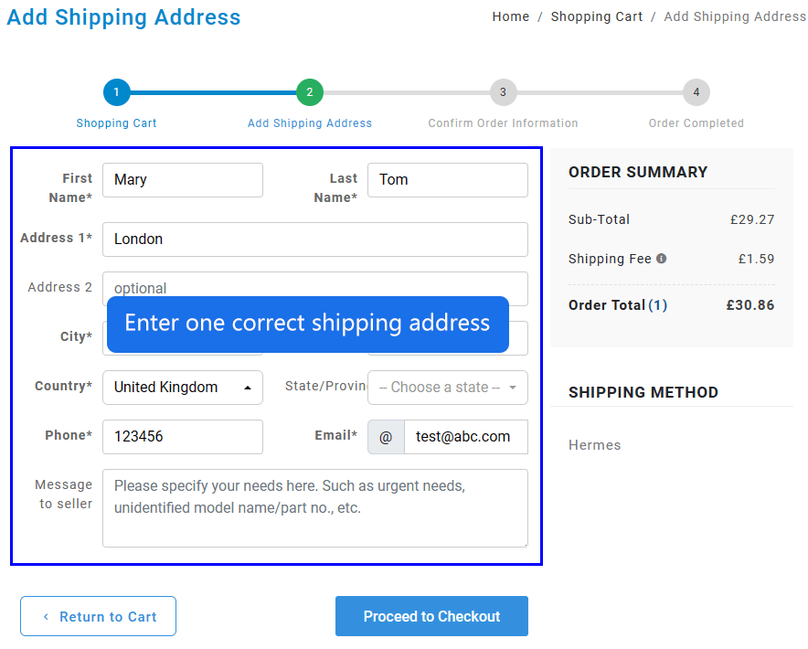 3The first checkout page is "Add Shipping Address",you can add or change shipping address, and enter "Special Instructions Or Comments" for your order. e.g. to an different dropship address.