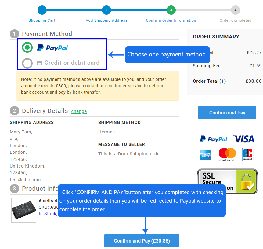 5Click "Confirm and pay" to create your order first and then be immediately directed to Paypal to complete your payment. You will receive an email confirming your order information.