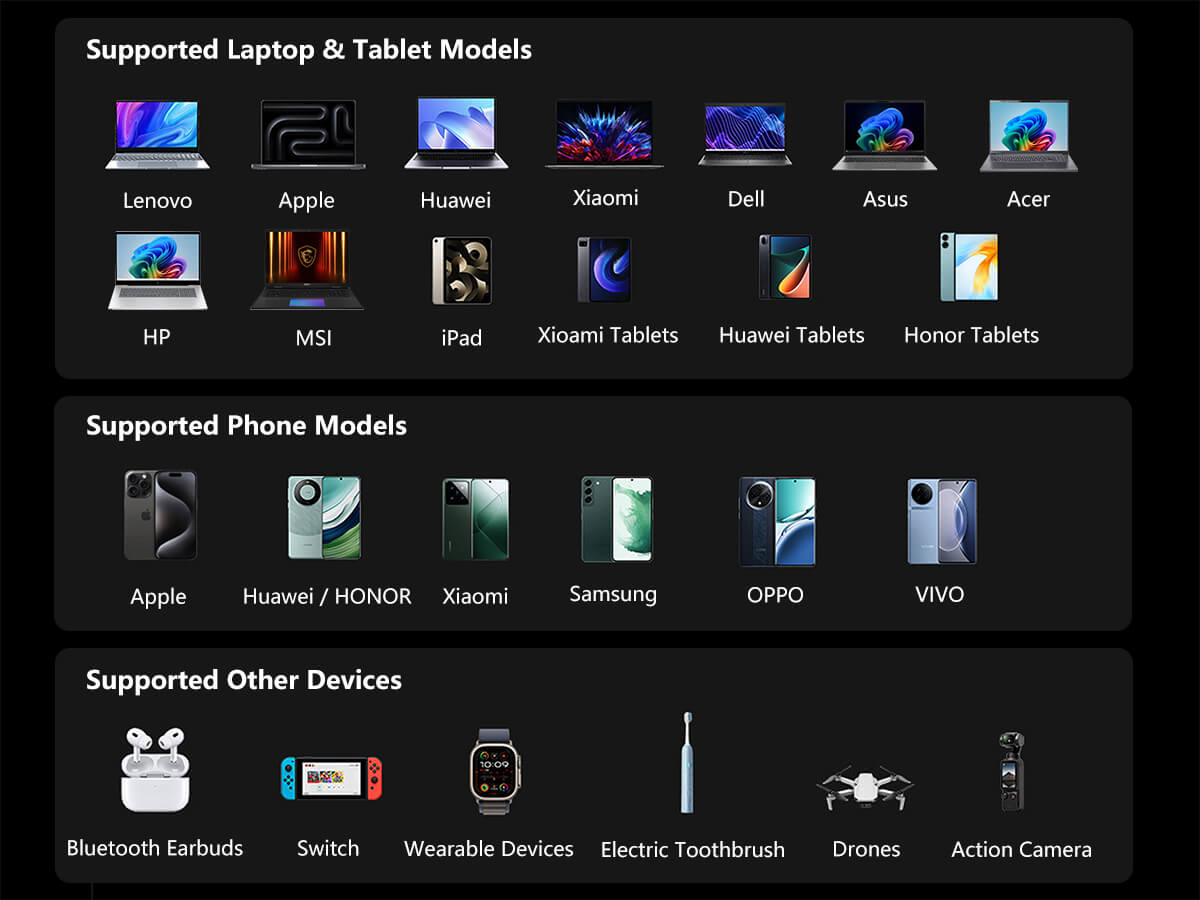 Charge multiple devices simultaneously with ease – from laptops and tablets to smartphones, handheld gaming consoles, drones, action cameras, and Bluetooth accessories. One power bank, endless charging possibilities.